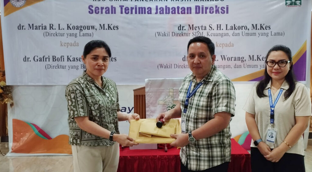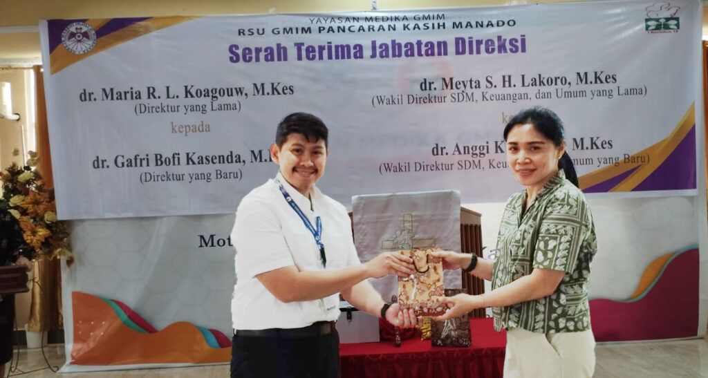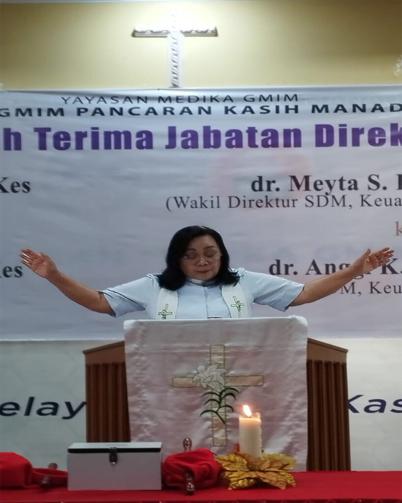 Ibadah Syukur dan Serah Terima Jabatan Direksi RSU GMIM Pancaran Kasih Manado yang dipimpin oleh Pdt. Deitje E. Karinda, M.Th selaku Bendahara Yayasan Medika GMIM dan dihadiri juga dr. Miitia C. Dolentelide, M.Kes selaku Sekretaris Yayasan Medika